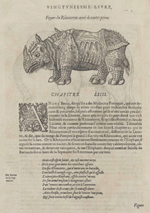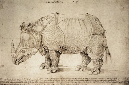 A principios del siglo XVIII, el libro Voyages et Aventures de François Legaut [1708] presentó un rinoceronte con un segundo cuerno que sobresalía hacia adelante desde su cresta. Esta estructura no se ha encontrado jamás en la vida real. ¿Por qué se enseña en un libro ilustrado del siglo XVIII? El primer estudio publicado de un rinoceronte [realizado por Albrecht Dürer en 1515], aunque poderosamente realista, cuenta con un pequeño cuerno secundario sobre el lomo que se proyecta hacia adelante. La imagen fue plagiada varias veces y -en cada nueva generación de copias– el segundo cuerno imaginario fue aumentando de tamaño. En el momento en que fue incluido en el libro de Legaut tiene el mismo tamaño que el cuerno real.
