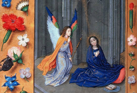 Miniatura de la Anunciación de un libro de horas probablemente iluminado en Gantes, c.1480