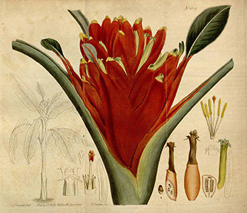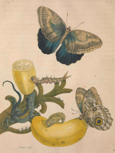 Con el nacimiento del siglo, trabajar en una gran obra ilustrada era sólo el comienzo. Maria Sibylle Merian [1647-1717] acababa de volver a Ámsterdam desde Surinam, cargada con dibujos y colecciones de plantas e insectos de la colonia de Sudamérica. Procedía de una familia con conexiones largamente establecidas en este campo. Su padre, Mathäus Merian, el Viejo, había heredado el Florilegium Novum de su suegro Johann Theodor de Bry, y publicado una nueva edición de su trabajo en 1641. Tras su muerte, unos años más tarde, la madre de María se casó con Jacob Marrell, un pintor de flores y floreros, y María a su vez se casó con Johann Graff de Nüremberg, uno de los pupilos de su padrastro. Unos años más tarde dejó a su marido por razones religiosas y en 1698 viajó a Surinam para estudiar, catalogar y dibujar diversos especímenes. Los resultados aparecen en un trabajo hermosamente ilustrado, Metamorphosibus Insectorum Surinamensium [1705]; una edición ampliada, con láminas adicionales hechas por su hija Joanna, apareció en 1714. Estas ediciones están ilustradas con bellos grabados, cada uno de ellos meticulosamente pintados a mano, que proporcionan un interesante ejemplo del periodo de transición entre el corpus en parte imaginario de las primeras ilustraciones y el avance hacia el realismo. Las ilustraciones tienen cualidades exageradas, con rasgos salientes y distorsionados que se adaptan a la visión del grabador. Algunas de las descripciones [y varias de las especies] son imaginarias y algunas tienen los detalles anatómicos en un orden equivocado. Su anacardo, por ejemplo, está dibujado al revés con relación a su raíz.