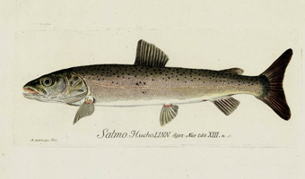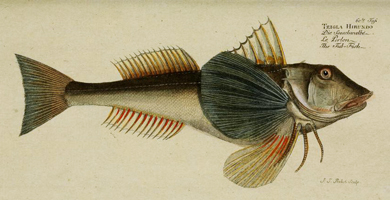 En Europa entre 1785 y 1794, Carl von Meidinger publicó Icones Piscium Austriae Indigenorum, con alegres grabados coloreados a mano. La técnica de la ilustración de especies de peces alcanzó su cumbre con uno de los más atractivos e interesantes tratados ilustrados sobre peces jamás publicado. Compilado por Marcus Elieser Bloch [1723-1799] y publicado con el título Icthyologie, ou Histoire Naturelle Générale et Particulière [1785-97], es un trabajo de una deslumbrante belleza y de tamaño considerable. Las páginas, formato folio están decoradas con notables y precisos grabados de especímenes de peces de todo el mundo. Las imágenes están coloreadas a mano y frecuentemente se usó pintura plateada para otorgar a los peces mayor realismo. |
