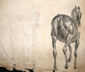 Doble imagen d anatómica de un caballo: a la izquierda del caballo desollado se incluye una imagen esquemática en la misma posición señalando los puntos descritos en los textos anatómicos.
