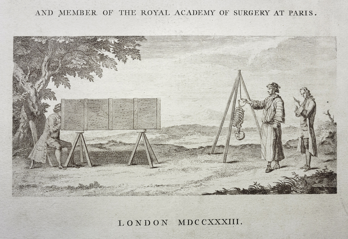 William Cheselden [1688-1752] es recordado hoy como uno de los mejores cirujanos ingleses, fue cirujano de la reina Carolina, esposa del rey Jorge II, a quien le dedicó el maravilloso y épico libro Osteographia, or the anatomy of the bones [1733], que se describe en la Biblioteca NYAM como "uno de las mejores obras inglesas con ilustraciones anatómicas". Las imágenes grabadas en cobre fueron realizadas por Cheselden y sus grabadores Gerard van der Gucht y Mr. Shinevoet, con el uso de la cámara obscura, una ayuda de dibujo pre-fotográfica, que es deliciosamente aludida en esta maravillosa imagen apareció en la portada del libro. |