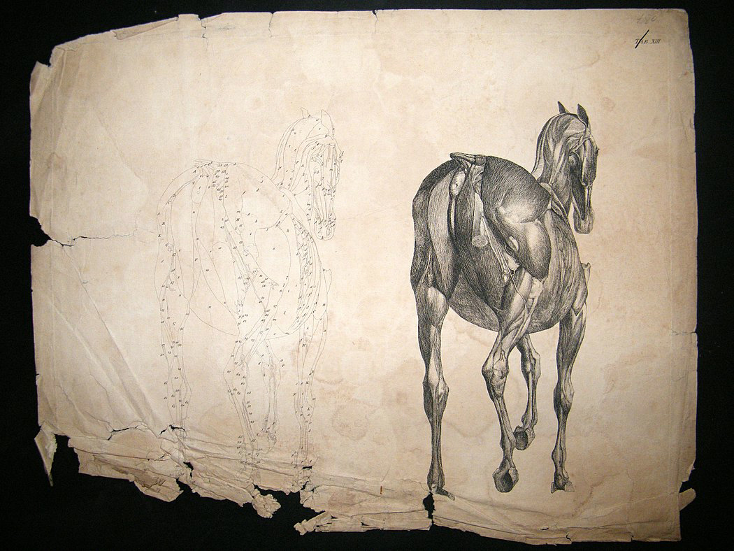 Doble imagen d anatómica de un caballo: a la izquierda del caballo desollado se incluye una imagen esquemática en la misma posición