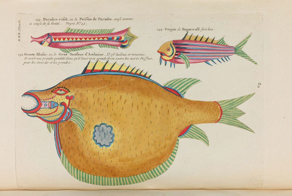 Publicado por primera vez en 1718, este libro ilustra vívidamente peces y cangrejos de diversos colores y formas extraordinarias que se encuentran alrededor de las islas de las Molucas y en las costas de las tierras del sur. El libro cuenta con 100 láminas y 460 grabados en cobre coloreados a mano de 415 peces, 41 de crustáceos, 2 insectos palo, un dugongo y una sirena del Océano Indo-Pacífico Occidental. Aunque las ilustraciones están llenas de adornos y coloreadas con libertad, la mayoría de los organismos representados son especies tropicales reales.
