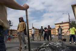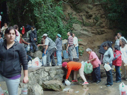 En la mañana, con cuatro bidones de 5 litros cada uno, partimos con mi hermano a buscar agua a la Cascada del Parque Ecuador.....por la tarde ya había una larga cola y muchísima gente...le dije que se adelantara mientras me estacionaba, que se fuese a ubicar mientras yo subía...la gente humilde... muy buena... me ayudaban a subir ... estaba muy empinado... los cuasi peldaños… altísimos y muy húmedos por el agua.... ¡no se vaya a resbalar!... ¡mucha gente ya ha caído ! claro, mi bastón ayuda para que la gente sea empática... en mi subida me percaté que un chorrillo de agua salía de entre las piedras… también había gente haciendo cola…esperando su turno… las conté... siete... le dije al último joven que me ayudara a pasar hacia el otro lado... debía hacerlo a horcajadas… como era complicado, el chico me dijo... “señora, mejor yo lo hago... yo se los lleno”... ¡qué gentileza! A Rubén no lo veía... estaría ya en lo más alto tratando de afirmarse para llegar al pozo de oro.... ya me habían llenado los dos bidones cuando lo veo que viene acercándose y diciéndome... ¡arriba es durísimo...y peligroso! le dije... “acá… ponte a la cola y llénalos....hum... el agua no estaba cristalina... es más, tenía residuos de barro, arena y quizás que más… pero ¡era agua! que podía ser usada con cloro para por lo menos lavarse las manos… o los dedos. Llegamos a casa.... Rubén, decidió hacer un hoyo... cerca del parrón....para hacer nuestras necesidades.... como pozo negro.... yo neura, fui la primera en inaugurarlo y luego taparlo con una tabla que él había encontrado. El día transcurrió lentamente... a veces apostados en el antejardín de la casa pensado que Carola podía aparecer [no lo comentábamos], veíamos pasar gente a pie de la población”Agüita de la Perdiz” con carros del supermercado llenos con alimentos… y artículos no necesarios...como bicicletas, licores... tranquilamente… a vista de todos.