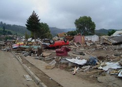 Alojamos en su parcela. Para mí terrible ya que la casa se había sacudido bastante y tenía una pared, la del baño, fracturada. El resto bien. Sin agua, luz ni gas. Otra boca de lobo. La casa está ubicada en una ladera, parecido a la del abuelo en Dichato, tipo palafito. Me imaginaba que en uno de los tantos movimientos podría rodar hacia abajo... Intenté dormí en el dormitorio de ellos, a un costado… vestida como lo había estado haciendo desde el terremoto. Los movimientos seguían así es que me fui al living esperando que aclarara. Mi amiga me acompañaba ya que estaba igual de asustada. Ya me habían dicho que no podía quedarme afuera, que podían asaltarnos.